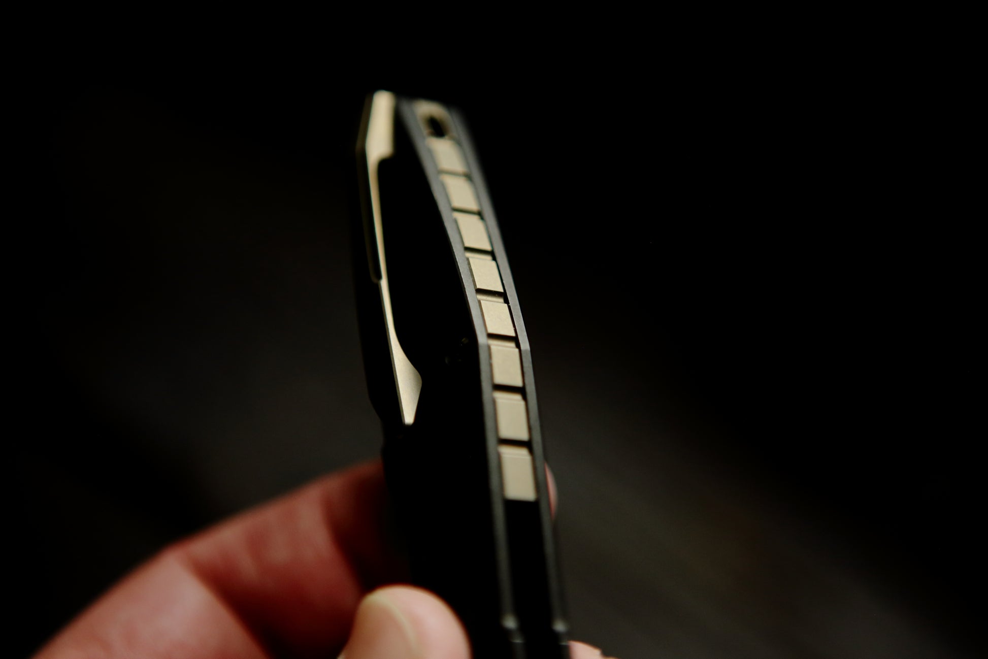 This particular variation has lightly stonewashed black PVD handles, a belt satin blade, and gold/bronze accents. The PVD handles provide an extra layer of durability while the gold/bronze accents provides some pizzazz.